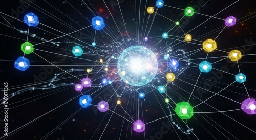 Abstract network of interconnected colorful polygons and glowing sphere