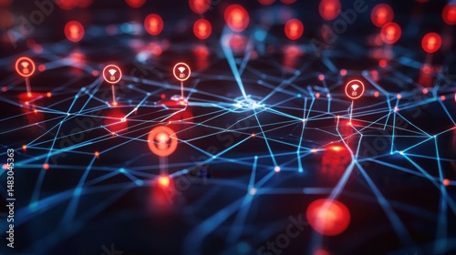 Abstract Network Visualization with Red Nodes and Blue Connections