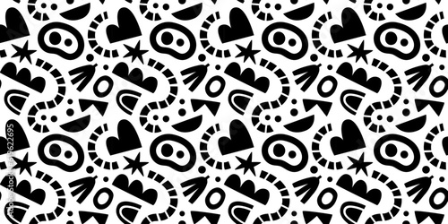 Abstract organic shape seamless pattern with black and white geometric doodles. Flat cartoon background, simple random shapes print texture.