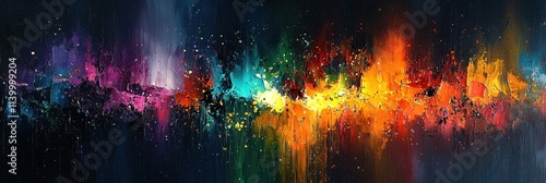 Abstract painting with vibrant colors blending into dark tones in a striking contrast