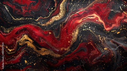 Abstract painting with vibrant red and gold swirls on a black background.