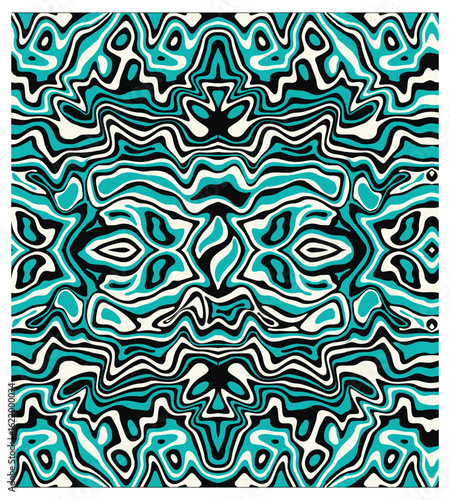 Abstract pattern featuring wavy turquoise, black, and white shapes that create a dynamic, hypnotic design with symmetrical motifs.