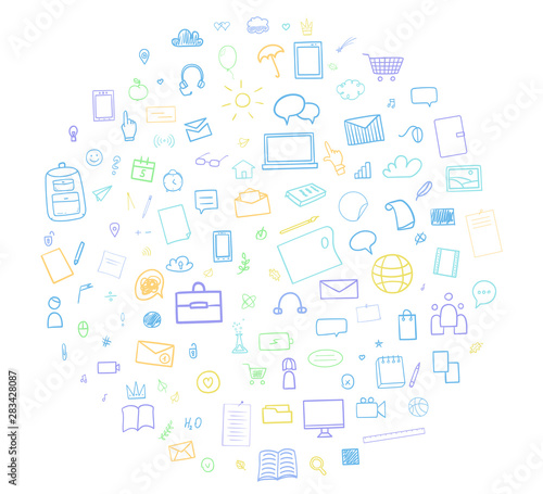 Abstract pattern with school supplies. Back to school. Set of different signs. Hand drawn infographic elements. Illustration for design