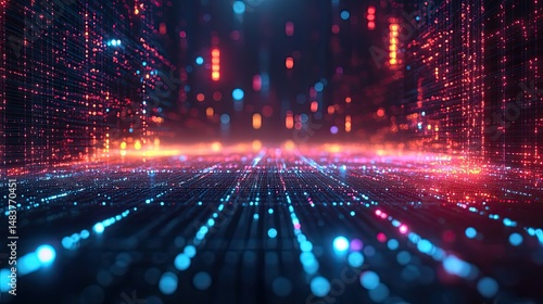 Abstract perspective view of glowing red and blue lights in a digital environment scene