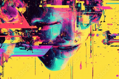 Abstract portrait of young female with vibrant colorful glitches on yellow background.