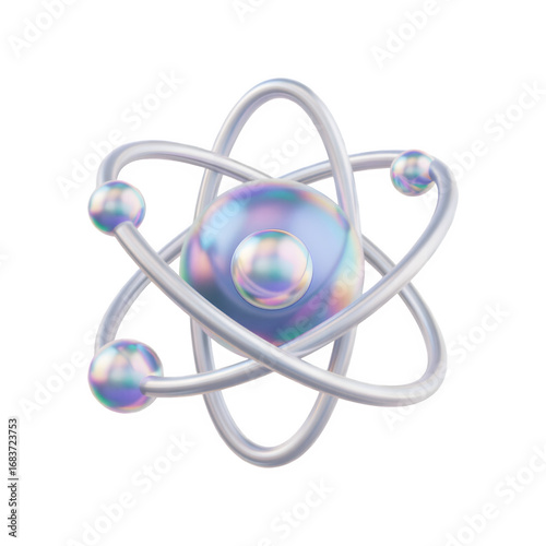 Abstract representation of a stylized atom with orbiting electrons on a transparent background