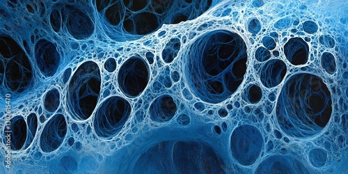 Abstract representation of blue organic patterns displaying intricate network structures and textures in a dark background