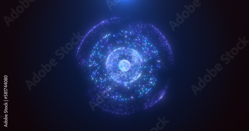 Abstract round blue sphere glowing energy magic molecule with atoms from particles and dots cosmic. Abstract background