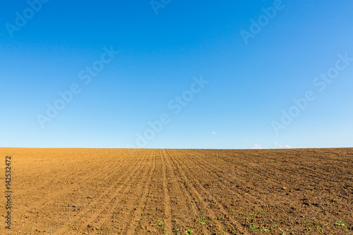 Abstract rural scenery in spring, with infinite horizon, bright colors, along natural lake with reed plants