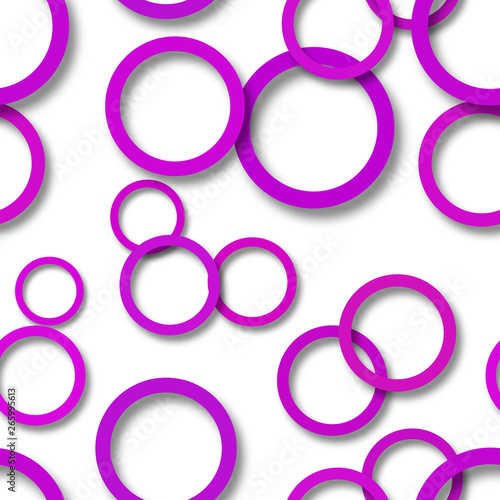 Abstract seamless pattern of randomly arranged purple rings with soft shadows on white background