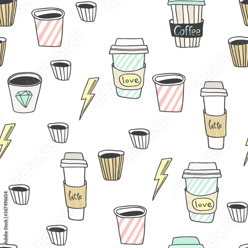 Abstract seamless pattern with hand drawn coffee to go cups. Beautiful modern texture with chaotic painted elements. Multicolored background for your web design, backdrops, wrapping