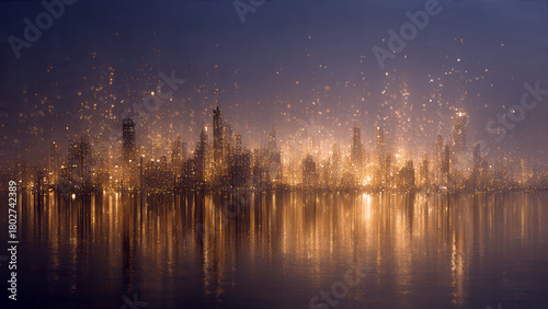Abstract Skyline Reflected In Water Under Golden Haze Sparkles With Bokeh Lights And Mystical Atmosphere