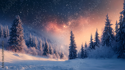 Abstract snowy landscape with pine trees and stars.