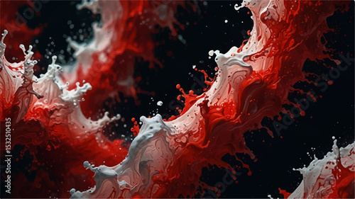 "Abstract splash of red and white liquid forming dynamic waves and droplets on a black background. High-speed motion, energetic flow, perfect for modern art, design, or dramatic visual effects"