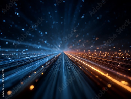 Abstract Stream of Blue and Orange Light Particles Speeding Through Dark Space