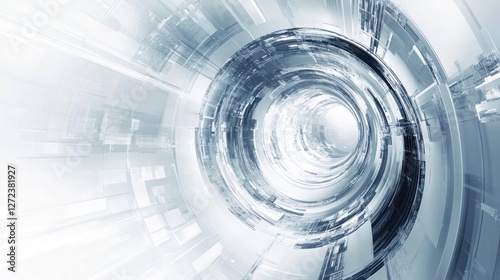 Abstract swirling technological tunnel, futuristic design, digital data flow, gray and white color palette.