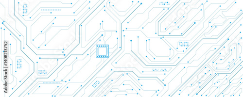 Abstract technology circuit diagram on white and blue background.