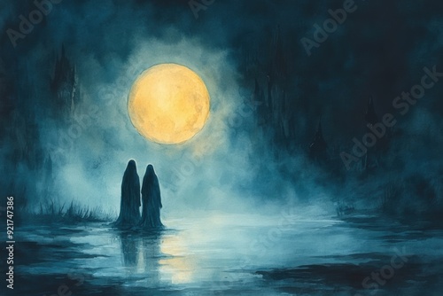 Abstract Watercolor Full Moon with Ghostly Figures in Eerie Atmosphere