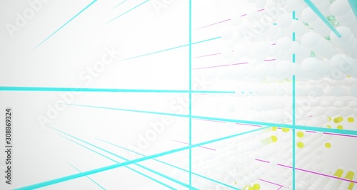 Abstract white and colored gradient glasses interior from array spheres with large window. 3D illustration and rendering.