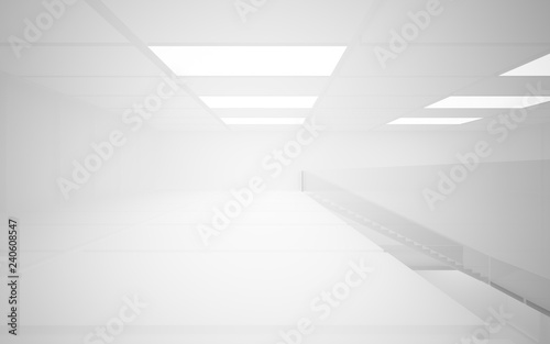 Abstract white interior multilevel public space with neon lighting. 3D illustration and rendering.