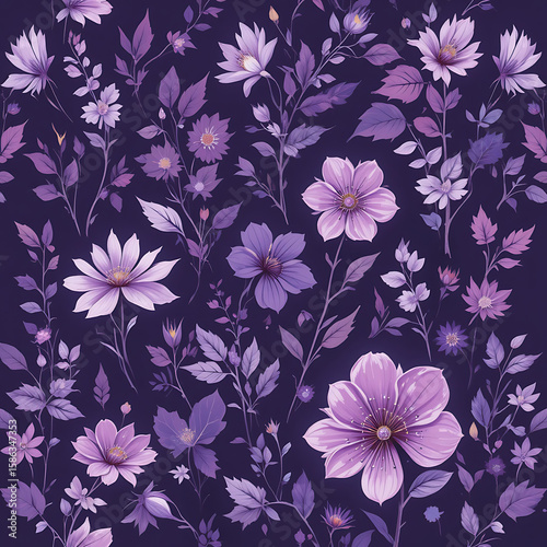 Abstract wild floral flowers with leaves and branches in purple and violet combination gradient colors, in dark purple background, minimalist style, artistic, water colors, seamless pattern, oil paint