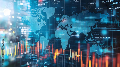 Abstract world map overlaid on financial data, symbolizing global trade and finance -