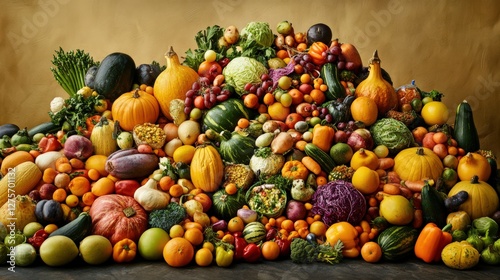 Abundant display of colorful fruits and vegetables arranged artistically on a textured backdrop