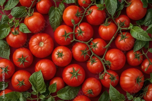 Abundant ripe red tomatoes with leaves in a natural setting