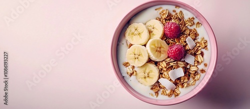Acai Bowl with Granola Bananas and Coconut Flakes on Pastel Background