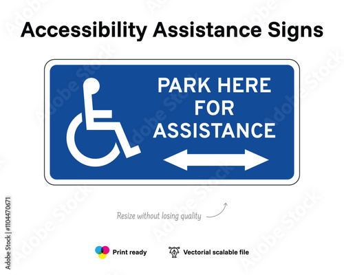 Accessibility assistance signs. Park here for assistance. Right and left arrow. Assistance sign with wheelchair symbol. Blue horizontal rectangle.