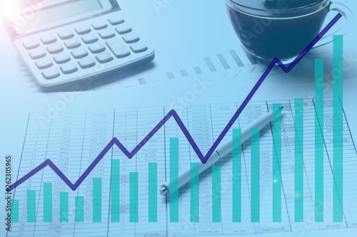 Accountant work table with calculator, charts and pen.