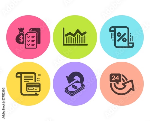 Accounting wealth, Cashback and Payment card icons simple set. Money diagram, Loan percent and 24 hours signs. Audit report, Financial transfer. Finance set. Flat accounting wealth icon. Circle button