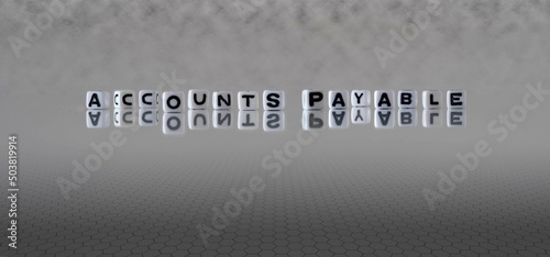 accounts payable word or concept represented by black and white letter cubes on a grey horizon background stretching to infinity