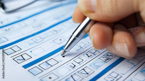 Accurate healthcare documentation, Doctor filling out survey paperwork and marking checkboxes. Ideal for themes of medical administration and patient care