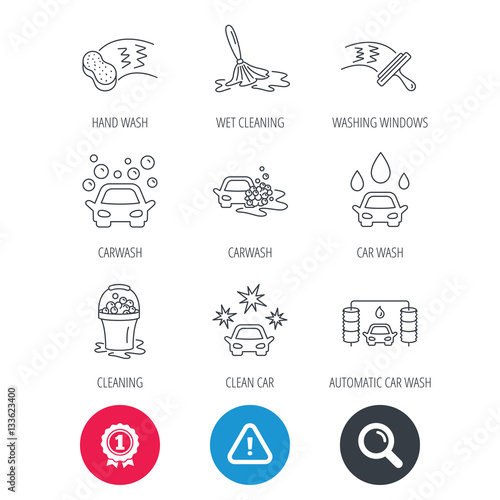 Achievement and search magnifier signs. Car wash icons. Automatic cleaning station linear signs. Washing windows, sponge and foam bucket flat line icons. Hazard attention icon. Vector