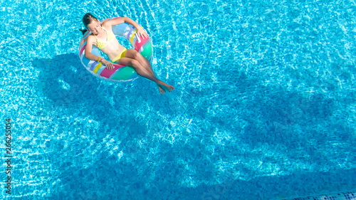 Acrive girl in swimming pool aerial top view from above, kid swims on inflatable ring donut , child has fun in blue water on family vacation resort