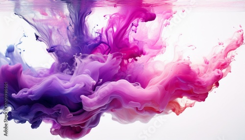 Acrylic ink cloud in water, abstract smoke with purple, blue, and pink tones on a white background.
