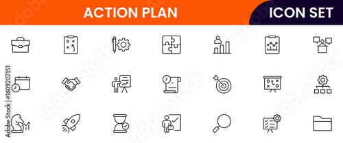 Action plan vector line icons featuring checklists, strategies, timelines, goals, tasks, progress tracking, decision making, teamwork, and project steps.