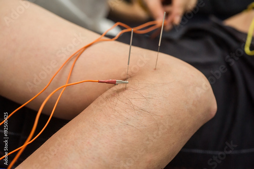Acupuncture specialist doctor inserting needle with electrode clamp into patient body for pain treatment..