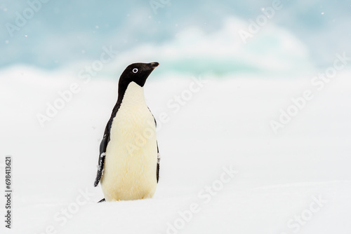 Adélie penguin (Pygoscelis adeliae) on sea-ice, Half Moon Island, Antarctica