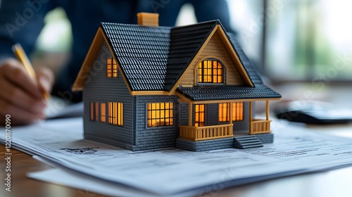 Adjuster inspecting paperwork beside a small house model, modern office decor and copy space