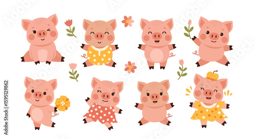 Adobe illustrator vector artwork set of cute pink pigs in various playful poses, adorned with flowers and leaves. Perfect for farm animals, children's designs, and cheerful themes