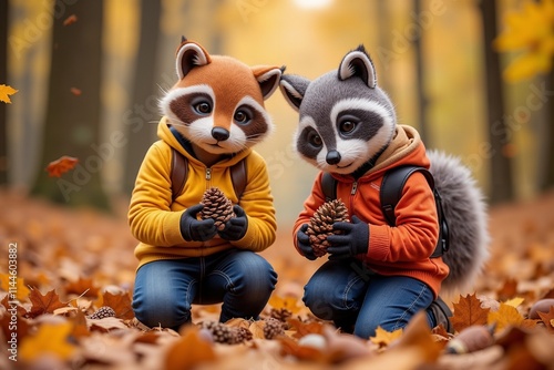 Adorable Autumn Forest Friends: Cute Raccoon Kids in Fall Foliage, Perfect for Kids' Room Decor, Greeting Cards, or Social Media Posts.