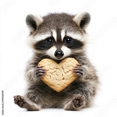 Adorable baby raccoon holding heart-shaped cookie in nature cute animal photography enchanting forest setting joyful mood