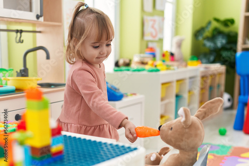 Adorable blonde girl play feeding rabbit doll at kindergarten