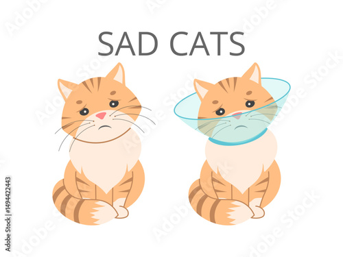 Adorable cartoon cats with sad expressions, wearing medical masks and bandages. Perfect for pet care, health, or emotional support designs.
