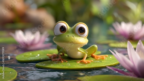 Adorable cartoon frog with big eyes sitting on a lily pad surrounded by water lilies