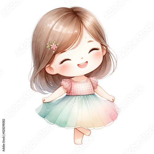 Adorable cartoon girl with brown hair and flower in pastel dress, smiling happily. Perfect for children's illustrations and cute character designs.