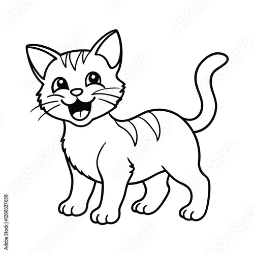 Adorable Cartoon Kitten, Happy Cat, Line Art, Black and White