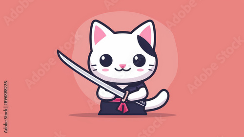 Adorable cat mascot dressed in traditional Japanese samurai attire, set against a minimalistic background.